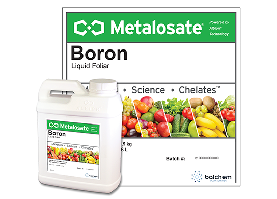 For best results, apply Metalosate® Boron liquid foliar according to recommendations based on plant tissue or soil analysis.