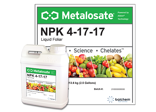 For best results, apply Metalosate® NPK 4-17-17 liquid foliar according to recommendations based on plant tissue or soil analysis.